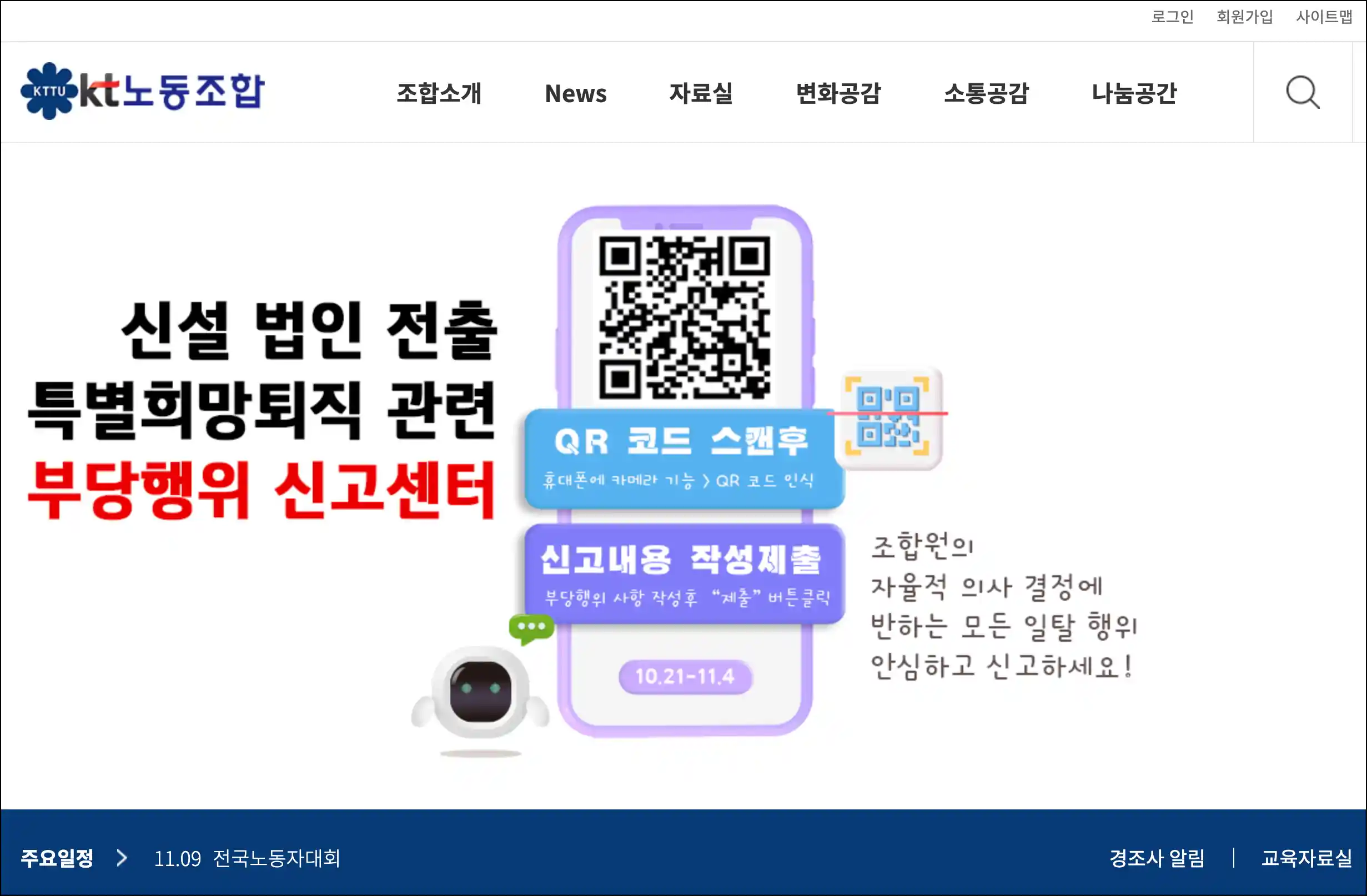 KT노동조합(KTTU) 사이트는 KT 직원들의 권익 보호와 노동 환경 개선을 위해 활동하는 노동조합의 공식 웹사이트입니다. 이 사이트는 조합원들이 회사의 경영 방침에 대해 논의하고, 고용 조건 개선과 복지 향상 등을 목표로 다양한 활동을 전개합니다. 또한, 구조조정, 인력 이동 등의 이슈에 대해 반대 입장을 밝히고 노동자들의 목소리를 반영하려는 노력을 하고 있습니다. 노동조합의 최신 소식과 성명서를 제공하며, 임금 협상, 조직 개편 관련 정보도 다룹니다.