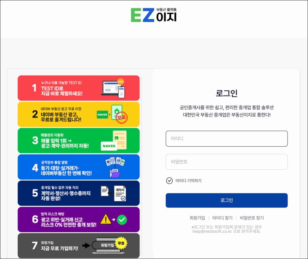 무료로 이용 가능하다는 안내가 있고, 테스트 계정이 제공되어 정식 개업하기 전에도 기능을 미리 경험해볼 수 있어요. 즉 개업공인중개사 등록 이전이라 해도 연습용으로 시스템을 익히는 데 역할이 있다고 합니다.