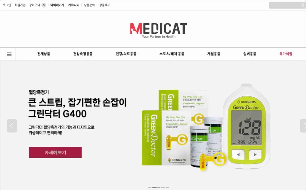 메디캣(www.medicat.co.kr)은 집에서 건강을 챙기려는 사람들에게 필요한 의료·건강용품을 편하게 살 수 있는 온라인 쇼핑몰이에요. 병원까지 가지 않아도 되는 것들, 예를 들어 혈당계나 혈압계 같은 자가측정 기기, 체온계, 구강관리 제품, 홈케어용 의료 소모품 등을 한곳에 모아둔 느낌이에요.