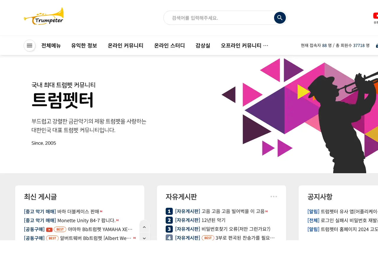 trumpeter.co.kr은 트럼펫을 좋아하는 사람들이 모이는 국내 최대 트럼펫 전문 커뮤니티 겸 전자상거래 플랫폼입니다. 회원수가 3만 7천 명을 넘을 정도로 꽤 규모 있는 온라인 커뮤니티예요.