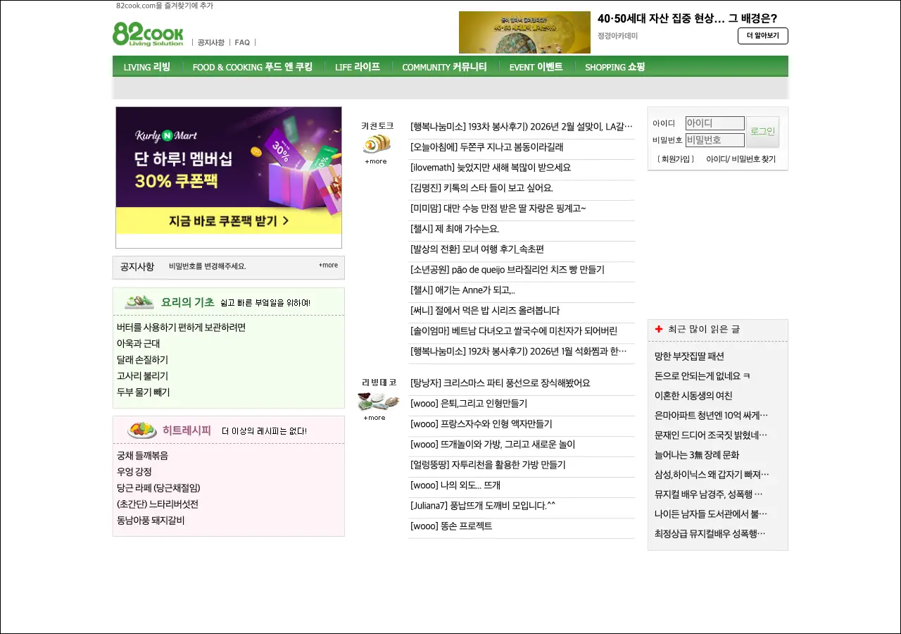82cook은 요리 레시피부터 살림 노하우, 자유 수다까지 다양한 주제의 글이 올라오는 여성 커뮤니티입니다. 이름에 cook이 들어가 있지만 실제로는 요리뿐 아니라 육아, 건강, 부동산, 생활 정보 등 생활 전반에 걸친 이야기가 활발하게 오가는 곳이에요.