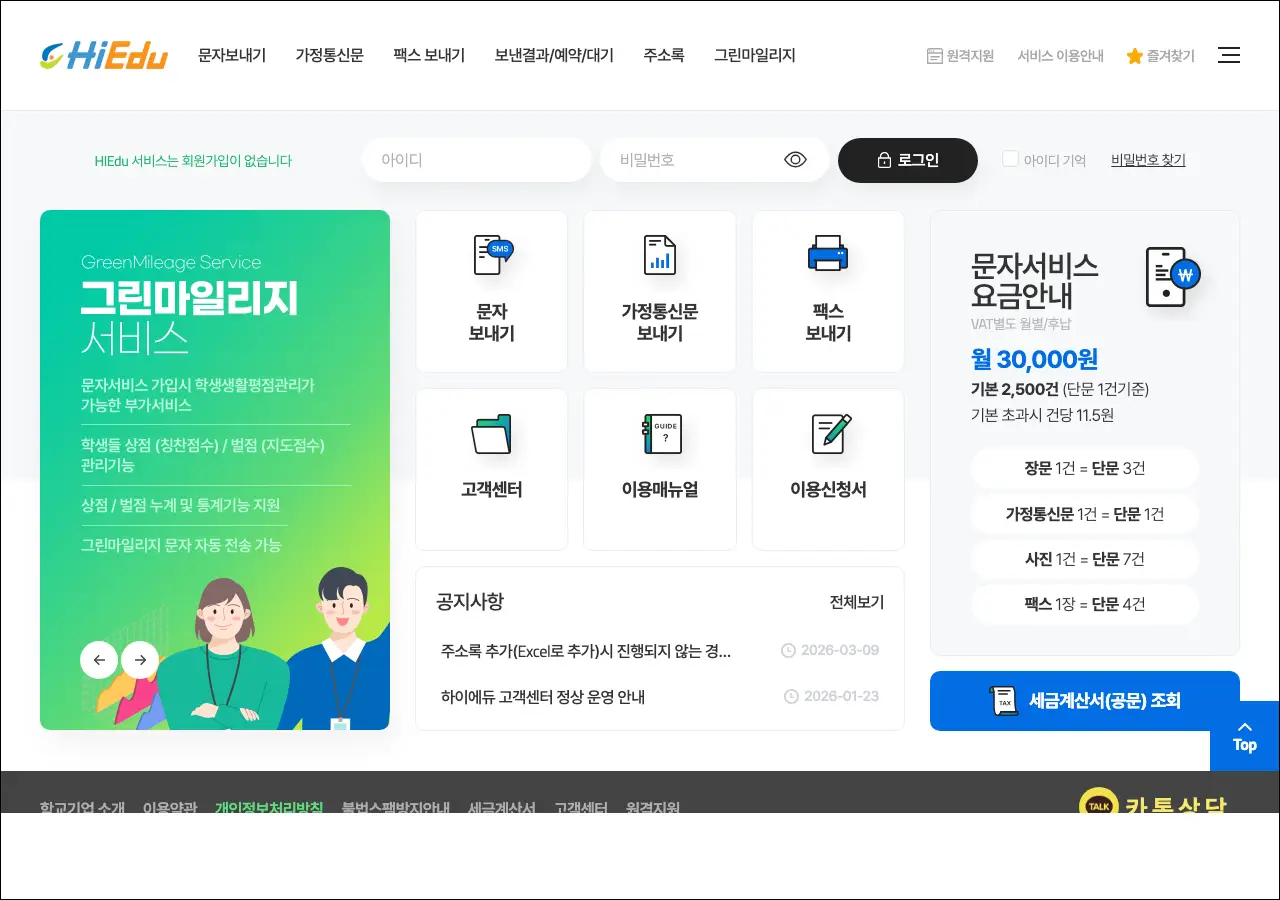 가정통신문 발송 기능도 있고, 학생 상벌점을 관리하는 그린마일리지 기능도 제공하고 있어요. 월 3만원 정도의 기본료로 이용할 수 있는 유료 서비스인데, 학교 단위로 가입해서 사용하는 경우가 많아요.