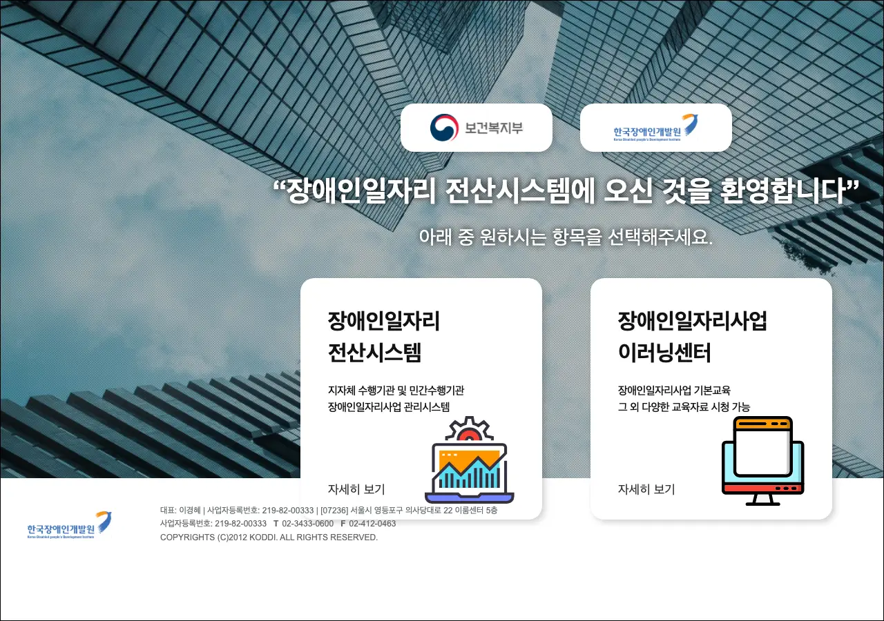 지방자치단체나 민간기관이 장애인 고용 프로그램을 관리할 수 있도록 해주는 시스템인데요, 장애인 고용 현황을 조회하거나 관련 보고서를 제출할 때 사용해요. e-러닝 센터도 운영하고 있어서 교육 자료도 이용할 수 있지요.