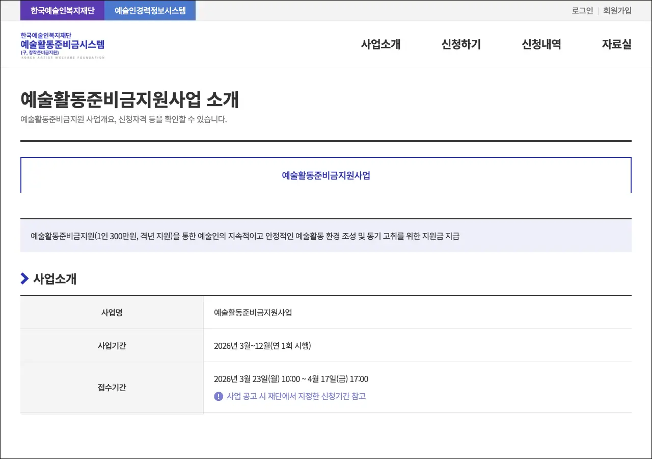 예술활동준비금시스템은 한국예술인복지재단에서 운영하는 사이트로, 예술인들에게 창작 활동 준비에 필요한 자금을 지원하는 사업을 안내하고 신청을 받는 플랫폼이에요. 예술 활동 증명을 받은 예술인이라면 누구나 신청 대상이 될 수 있습니다.