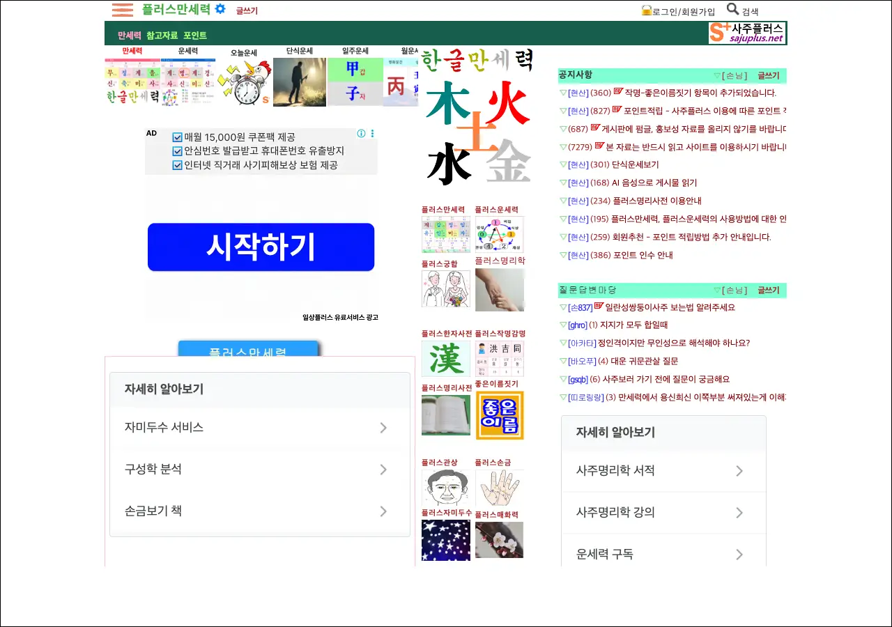 사주나 만세력에 관심 있으신 분들이 이용하기 좋은 사이트인데요, 플러스만세력은 온라인으로 만세력을 확인할 수 있는 서비스입니다. 생년월일시를 입력하면 사주팔자와 만세력 정보를 바로 조회할 수 있는 구조로 되어 있어요.