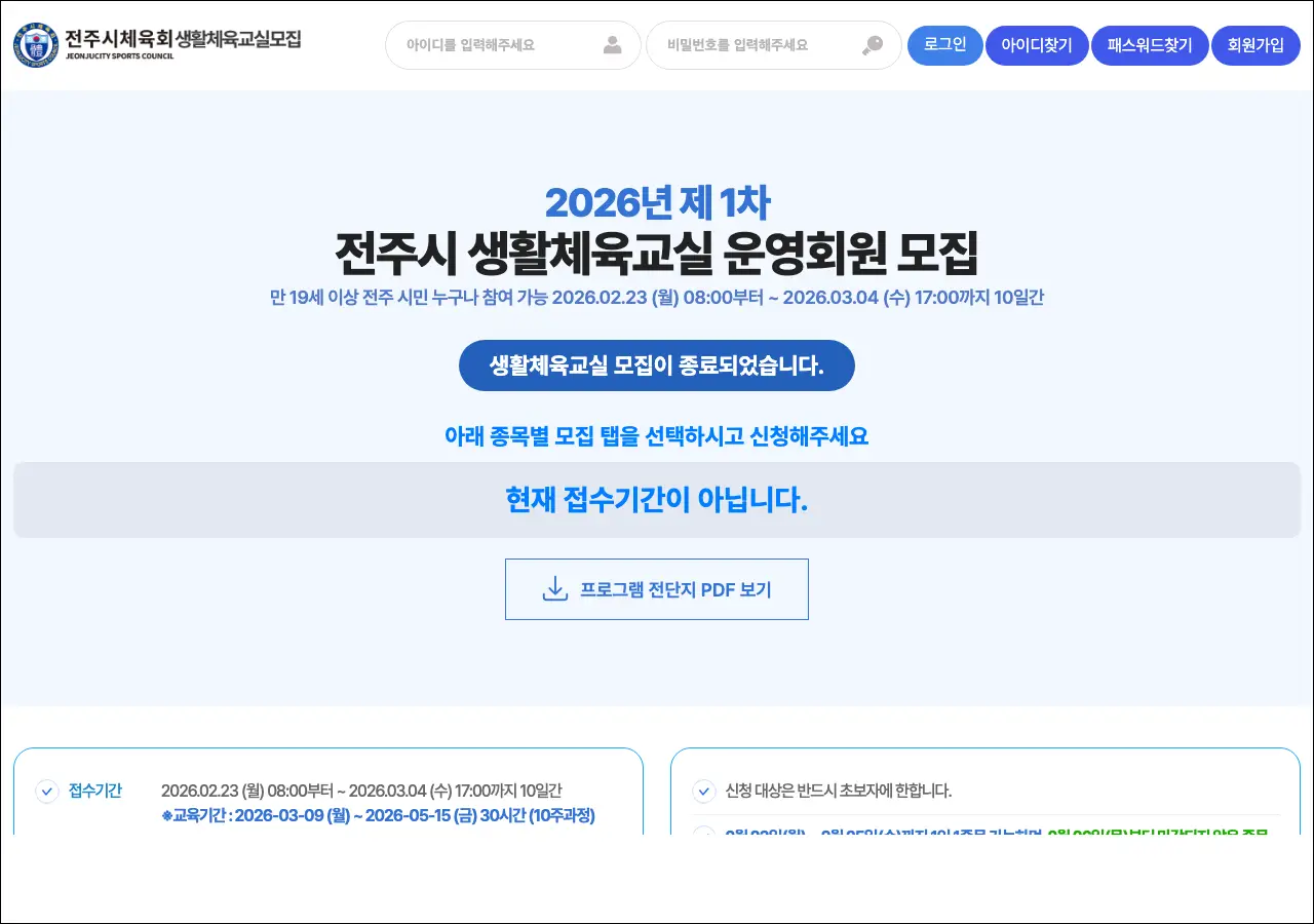 전주시 생활체육 교실 홈페이지로, 전주 지역 주민들을 위한 다양한 생활체육 프로그램 정보를 제공하는 사이트예요. 수영, 헬스, 요가, 배드민턴 같은 체육 교실 일정과 수강 신청을 할 수 있는 곳입니다. 전주에 거주하시면서 생활체육에 참여하고 싶으신 분들이 참고하면 유용한 사이트예요.