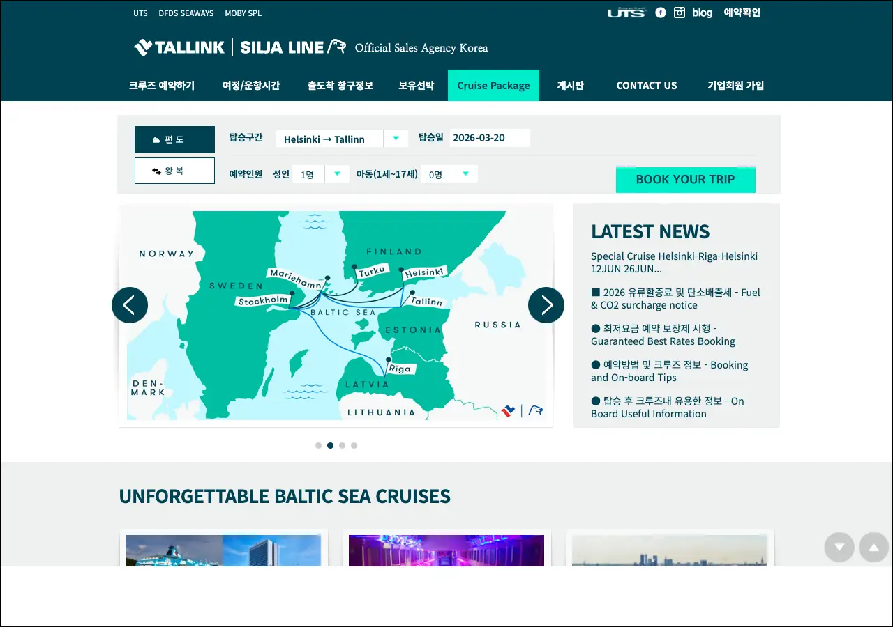 실자라인 한국 공식 사이트로, 북유럽 크루즈 페리 브랜드인 탈린크 실자라인(Tallink Silja Line)의 한국어 안내 페이지입니다. 핀란드와 스웨덴, 에스토니아를 오가는 크루즈 페리 예약 정보를 한국어로 확인할 수 있어요. 발트해를 건너는 크루즈 여행에 관심 있는 분들이 참고하기 좋은 사이트입니다.