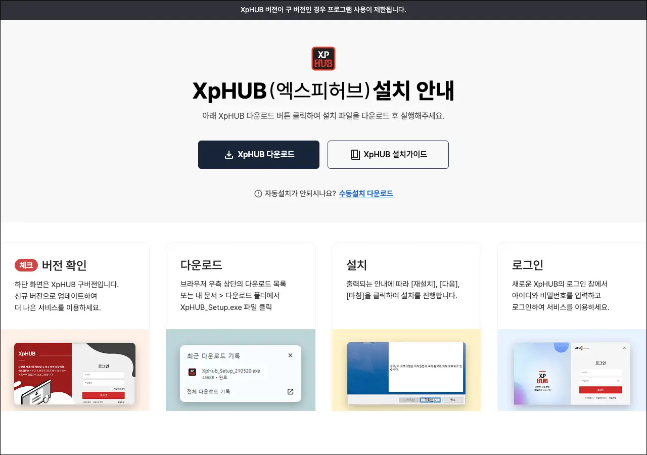 XpHUB는 xperp에서 제공하는 소프트웨어 설치 및 배포 플랫폼이에요. 접속하면 프로그램 다운로드와 관련 문서를 확인할 수 있는 깔끔한 페이지가 나옵니다. 기업용 솔루션을 설치하기 위한 허브 역할을 하는 사이트로 보이더라고요.