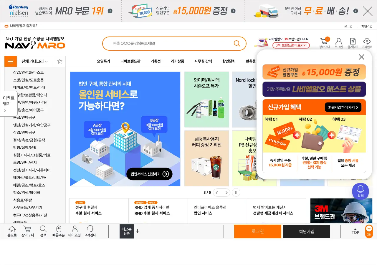 나비엠알오는 기업 전용 B2B 종합 쇼핑몰이에요. 산업안전용품, 포장용품, 전동공구, 실험기자재, 사무용품 등 폭넓은 제품군을 취급하고 있습니다. 법인 고객을 위한 후불결제 제도가 있어서 월별로 일괄 납부가 가능하고 세금계산서도 한 장으로 합산 발행해준다는 게 편리한 점이에요. 요일별 특가 프로모션이나 카테고리 할인 달력도 운영하고 있어서 기업 구매 담당자분들이 참고하기 좋은 곳입니다.