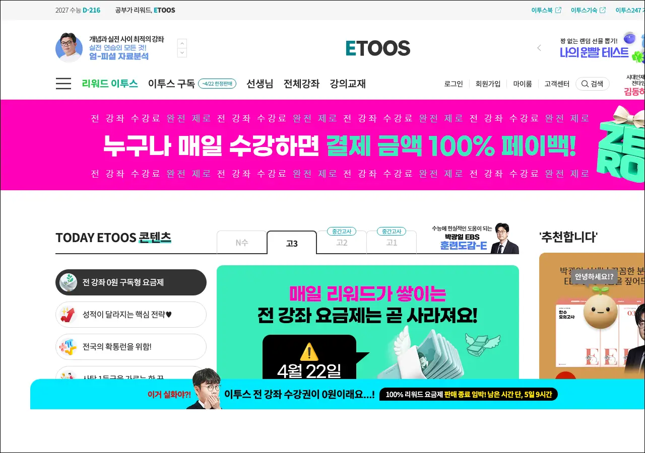 유명 강사 라인업이 탄탄한 편이라서 과목별로 선호하는 스타일에 맞춰 고를 수 있는 게 장점입니다. 단과 강좌부터 프리패스 형태의 전 과목 패키지까지 수강 방식이 다양하고, 모의고사 대비 특강이나 EBS 연계 분석 강의도 시기별로 따로 마련돼 있어요. 자사 모의고사인 이투스북 문제풀이 콘텐츠도 함께 활용할 수 있고 모바일 앱으로 언제 어디서든 강의 수강이 가능해서 통학 시간이나 쉬는 시간에 짤막하게 돌려보기에도 좋습니다. 학부모 입장에서도 학습 진도 관리 기능이 잘 돼 있어 자녀 공부 흐름을 확인하기 편하다는 평이 많아요.