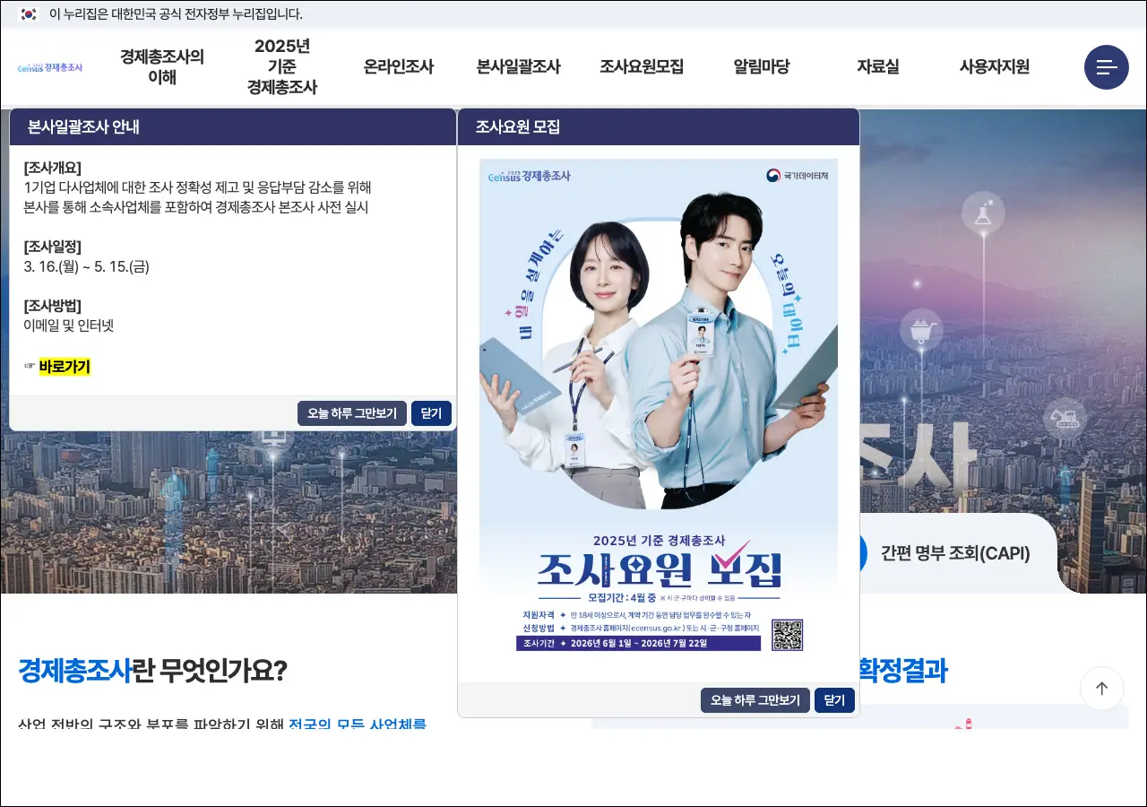 통계청에서 운영하는 경제총조사 전용 온라인 신고 사이트입니다. 5년마다 시행되는 경제총조사의 인터넷 응답 창구 역할을 하며, 2025년 기준 경제총조사 관련 안내와 신고를 이 사이트에서 진행합니다.