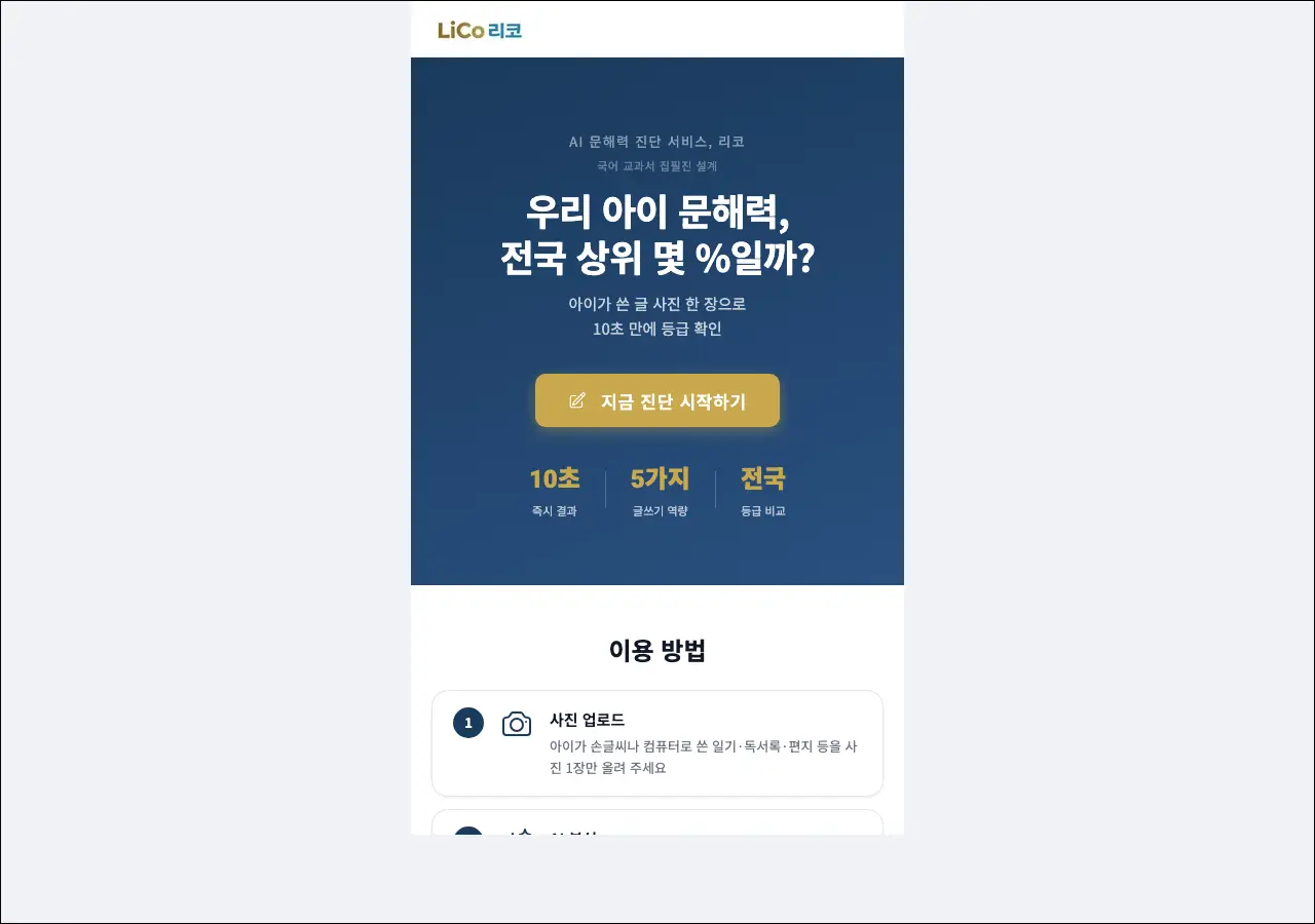 리코는 아이의 글쓰기 역량을 진단해 주는 서비스입니다. 학원이나 학교에서 글쓰기를 평가받기는 쉽지 않은데, 여기서는 아이가 쓴 글을 업로드하면 어휘력, 문장 구성, 논리력 같은 항목별로 점수와 피드백을 받을 수 있어요. 초등 고학년부터 중학생 자녀를 둔 부모님이라면 한 번쯤 써볼 만합니다.