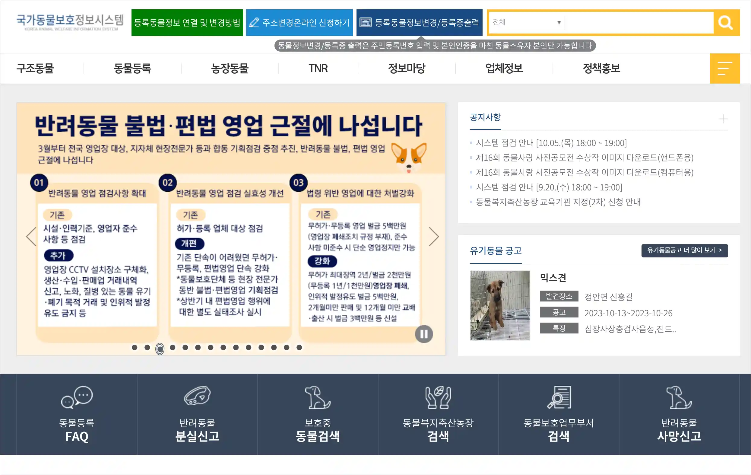 동물 학대를 예방하고 생명 존중의 문화를 촉진합니다. 국민 소득 증가와 핵가족의 확산으로 인해, 개나 고양이와 같은 반려동물을 키우는 가정이 크게 증가하였습니다. 그러나 소유자의 부주의로 인해 동물을 잃어버리거나 경제적 이유로 동물을 버리는 사례도 증가하고 있습니다. 또한 반려동물의 관리 부주의로 도시미관이나 공중위생에 영향을 미치고 이웃에 피해를 주는 경우도 적지 않습니다. 더 나아가, 아직도 우리 사회에서 동물에게 잔인한 방법으로 다루거나 상처를 입히는 동물학대 행위가 가끔 발생하며, 성숙한 동물 보호 및 관리 문화가 완전히 정착하지 못한 상황입니다. 동물 보호법은 동물학대를 방지하고 동물을 보호하고 관리하며 공중위생에 해를 끼치는 것을 막기 위한 필요한 규정을 마련함으로써, 동물의 생명과 안전을 보호하고 복지를 증진시키며, 사람과 동물이 공존하며 생명을 존중하는 사회를 구축하고자 합니다.